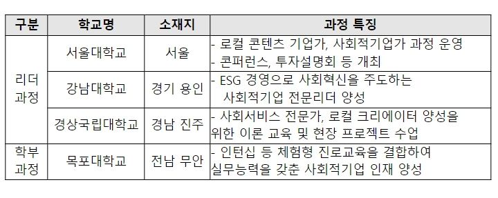 선도대학은 대학의 전문교육 인프라를 활용해 각 지역의 사회적기업이 필요로 하는 핵심 인재를 양성하는 사업으로 올해는 서울대(서울), 강남대(경기 용인), 경상국립대(경남 진주), 목포대(전남 무안)가 참여한다. 서울대, 강남대, 경상국립대는 리더과정을, 목포대는 학부과정을 개설한다.
