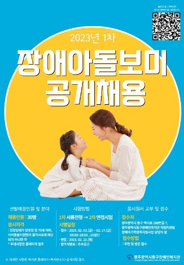 [제주교통복지신문 김강석 기자] 광주광역시동구장애인복지관은 장애아가족 양육지원사업에 참여할 ‘장애아 돌보미’를 공개 모집한다고 밝혔다.