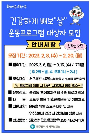 [제주교통복지신문 김강석 기자] 광주 서구는 지역주민의 신체활동 증진 및 체지방 감소를 위해 대면 운동프로그램‘건강하게 빼보살’참여자를 오는 8일부터 20일까지 선착순으로 40명 모집한다.