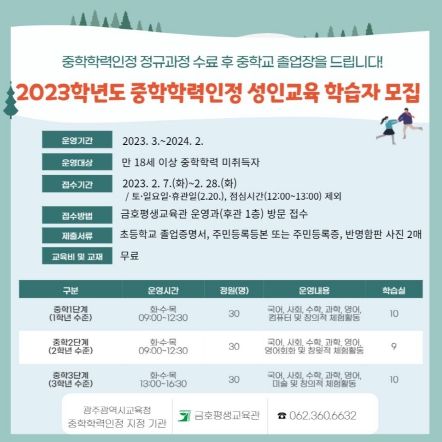 6일 금호평생교육관에 따르면 ‘2023학년도 중학학력인정 성인교육’은 1~3단계로 운영된다. 각 단계별로 30명씩 총 90명을 모집하며, 만 18세 이상 중학 학력 미취득 성인을 대상으로 한다.