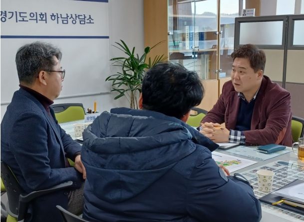 [제주교통복지신문 김강석 기자] 경기도의회 도시환경위원회 김성수(국민의힘·하남2) 의원은 6일 경기도의회 하남상담소에서 경기주택도시공사(이하 GH) 하남사업단 단장으로부터 하남교산 공공주택지구 (가칭)주민생계조합 협의 추진현황을 보고받고 주요 현안을 논의하는 자리를 가졌다.