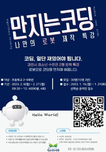 [제주교통복지신문 김강석 기자] 6일 과천시 청소년수련관이 2월 방학 특강으로 ‘만지는 코딩, 나만의 로봇 제작 특강’을 개강한다.