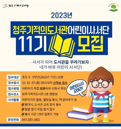 [제주교통복지신문 김강석 기자] 청주기적의도서관은 어린이 독서 동아리‘어린이사서단(11기)’15명을 모집한다고 6일 밝혔다.