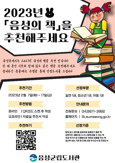 2023년 음성의 책 후보도서 추천은 도서관 홈페이지 공지사항에서 QR코드를 활용해 제출하거나 도서관 자료실에 비치된 추천서를 작성해 대출카운터에 제출하면 된다.