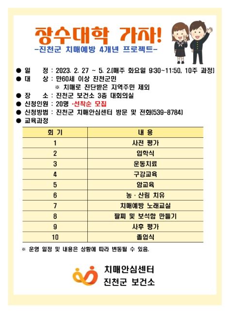 [제주교통복지신문 김강석 기자] 진천군 치매안심센터는 만 60세 이상 지역사회 내 어르신들을 대상으로 치매예방프로그램 ‘장수대학 가자’의 참여자를 모집한다고 7일 밝혔다.