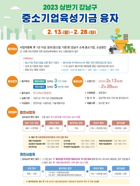 [제주교통복지신문 김강석 기자] 꿈이 모이는 도시, 미래를 그리는 강남구가 고금리 및 경기침체로 어려움을 겪고 있는 중소기업과 소상공인을 위해 올해 300억원 규모의 융자 지원사업을 시행한다. 상반기 200억원, 하반기 100억원으로, 상반기 융자 신청을 오는 13일부터 시작한다.