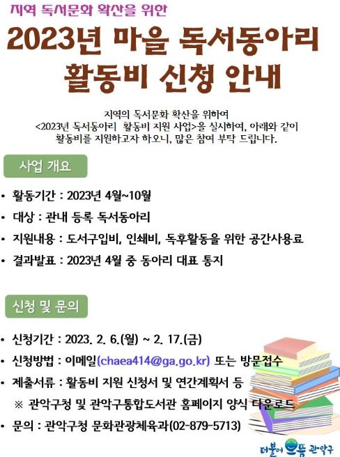 [제주교통복지신문 김강석 기자] 관악구가 지역 독서동아리 네트워크 활성화 및 독서문화 진흥을 위해 ‘2023년 마을 독서동아리 활동비 지원 사업’ 공모를 실시한다.