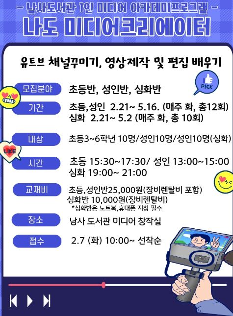 남사도서관 미디어창작실에서 열리는 이번 프로그램은 콘텐츠 기획부터 촬영, 영상편집 등 실습 위주의 맞춤형 강의로 진행된다.