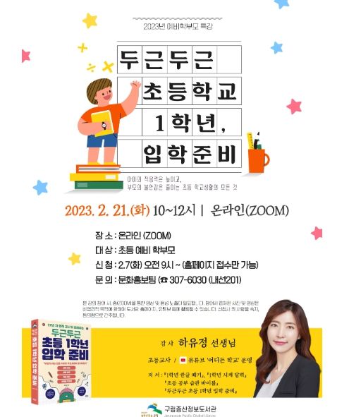 [제주교통복지신문 김강석 기자] 서울 은평구 구립증산정보도서관은 오는 21일 오전 10시 자녀들의 초등학교 입학을 준비하는 예비 학부모들을 대상으로 온라인(ZOOM) 특강을 개최한다.