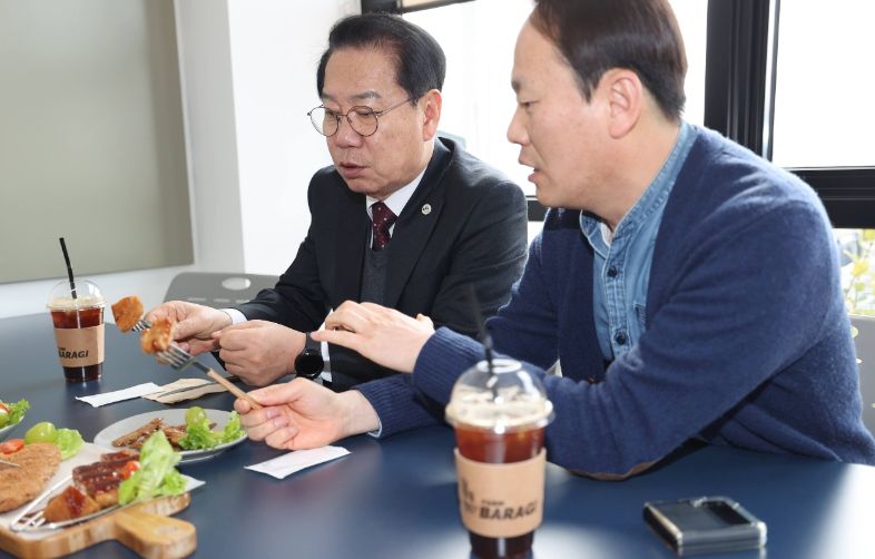송인헌 괴산군수는 지난 6일 괴산읍 대제산업단지에 위치한 푸드테크 기업 ㈜뜨란을 방문해 설비시설 구축 상황을 확인하고 애로사항을 청취했다.
