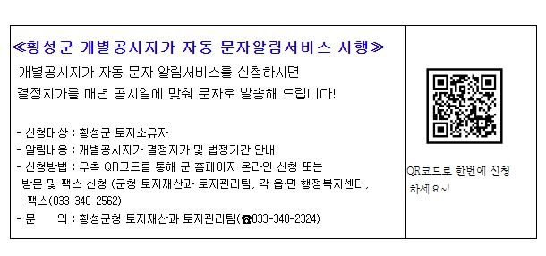 [제주교통복지신문 김강석 기자] 횡성군은 올해 개별공시지가를 문자메시지로 신속하게 알려주는'개별공시지가 자동 문자알림서비스'를 시행한다고 밝혔다.