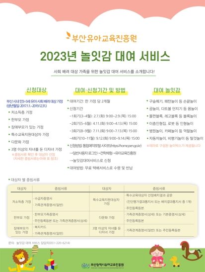 [제주교통복지신문 김강석 기자] 부산광역시유아교육진흥원은 교육격차 해소를 위해 저소득층, 한부모, 장애부모 가정 등 사회적 배려 대상 가정 중 만 3~5세 유아를 둔 120가정을 대상으로 ‘놀잇감 대여 서비스’를 실시한다.