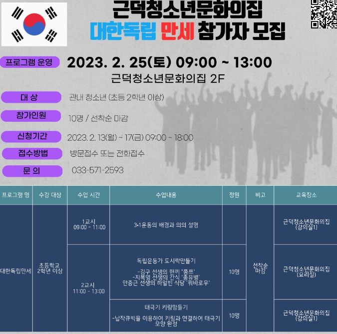 [제주교통복지신문 김강석 기자] 삼척시 근덕청소년문화의집은 2월 13일부터 17일까지 관내 초등학교 2학년 이상 청소년 20명을 모집하여, ‘대한독립만세’ 프로그램을 2월 25일(토)에 운영한다.