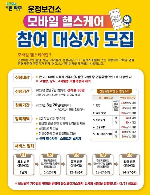 [제주교통복지신문 김강석 기자] 파주시 운정보건소는 스마트폰 앱을 통해 맞춤형 건강관리 서비스를 제공하는 모바일 헬스케어 사업 참여자 80명을 2월 7일부터 선착순으로 모집한다.