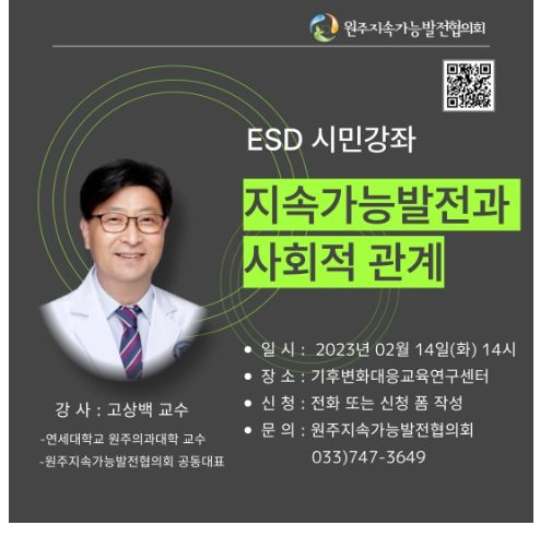 [제주교통복지신문 김강석 기자] ‘지속가능한 원주 만들기’를 위한 2023 ESD 시민강좌 '지속가능발전과 사회적 관계'가 오는 14일 오후 2시 행구동 수변공원 내 기후변화대응교육연구센터에서 열린다.