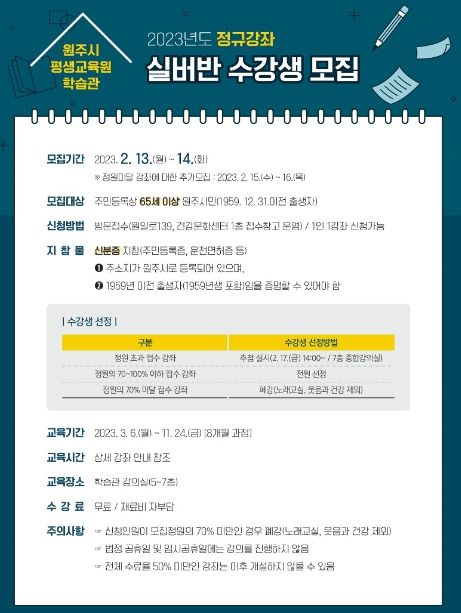 [제주교통복지신문 김강석 기자] 원주시 평생교육원 학습관은 2023년 정규강좌 실버반 수강생을 모집한다고 밝혔다.
