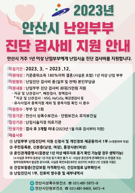 [제주교통복지신문 김강석 기자] 안산시는 아이를 원하는 난임 부부의 경제적 부담을 완화하고 건강한 출산을 지원하기 위해 난임 진단 검사비 지원사업을 추진한다고 7일 밝혔다.