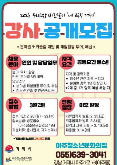 강사 모집에 관련된 사항은 거제시청 누리집 고시공고를 통해 확인할 수 있으며, 채용에 관한 자세한 사항은 아주청소년문화의집으로 문의하면 된다.