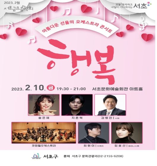 [제주교통복지신문 김강석 기자] 서울 서초구는 오는 10일 19시 30분에 서초금요음악회 2월 특별공연 '행복'을 서초 문화예술회관 아트홀에서 연다.