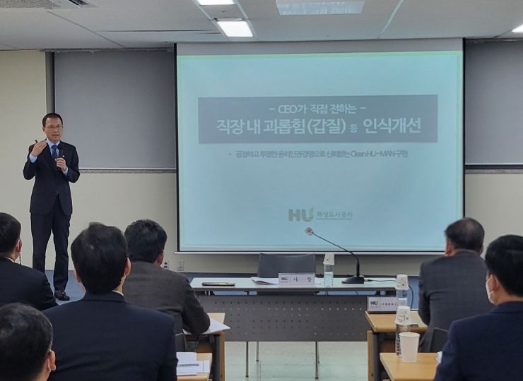 HU공사 김근영 사장은 취임 이후 건전한 조직 문화 확립을 최우선 목표로 설정하고 소통·청렴·인권 등의 가치를 강조했으며, 지난 6일에 진행된 2월 전체 간부회의에서는 최근 사회적으로 쟁점이 된 직장 내 괴롭힘을 방지하기 위한 사내 교육을 직접 실시했다.