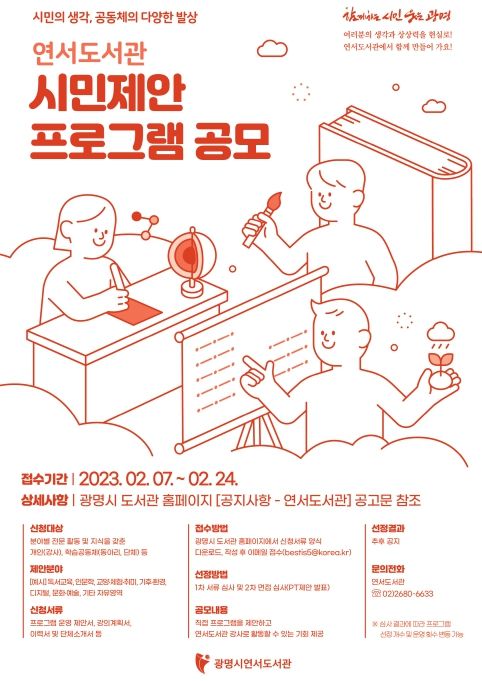 [제주교통복지신문 김강석 기자] 광명시 연서도서관은 오는 24일까지 ‘시민의 생각, 공동체의 다양한 발상’-『2023년 연서도서관 시민제안 프로그램』을 공모한다.