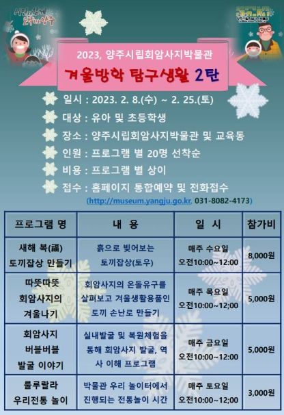 [제주교통복지신문 김강석 기자] 양주시립회암사지박물관은 오는 8일부터 25일까지 관내 유아와 초등생을 대상으로 겨울방학 특별프로그램 ‘겨울방학 탐구생활’ 2탄을 운영한다고 밝혔다.
