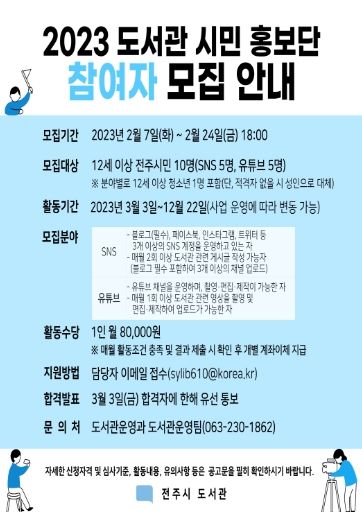 한편 도서관 시민 홍보단에 대한 자세한 자격요건 및 심사기준은 전주시 누리집 고시·공고 게시판을 통해 확인할 수 있으며, 기타 자세한 사항은 전화(063-230-1862)로 문의하면 된다.