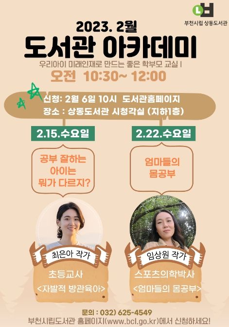 [제주교통복지신문 김강석 기자] 부천시 상동도서관은 이달부터 시민 지식역량 강화를 위한 ‘2023년 도서관 아카데미 강좌’ 운영을 시작했다.