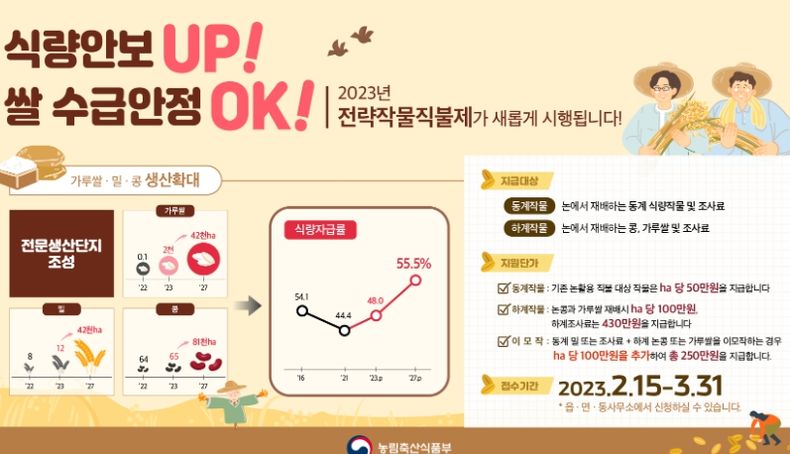 전략작물직불금은 겨울철 식량작물이나 조사료를 재배하면 ha당 50만원, 여름철 논콩, 가루쌀은 100만원, 조사료는 430만원을 지급하며, 겨울철에 밀․조사료와 여름철에 논콩․가루쌀을 이모작하면 100만원을 추가로 지급한다.