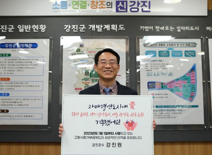 강 군수는 강진군 자매결연 도시인 부산 금정구, 경기 남양주시, 서울 관악구, 광주 동구 4곳에 고향사랑기부금을 전달하며 자매결연 도시 간 상생발전을 응원했다.