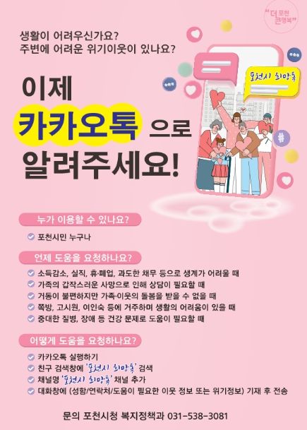 [제주교통복지신문 김강석 기자] 포천시는 위기가구 비대면 상시 신고 창구인 카카오톡 채널 ‘포천시 희망톡’을 운영한다.