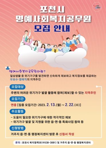 [제주교통복지신문 김강석 기자] 포천시는 2월 13일부터 22일까지 10일간 위기이웃 발굴과 지원 활동에 참여할 명예사회복지공무원을 집중 모집한다.