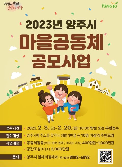 [제주교통복지신문 김강석 기자] 양주시는 오는 20일까지 ‘2023년 양주시 마을공동체 공모사업’에 참여할 마을공동체를 모집한다.