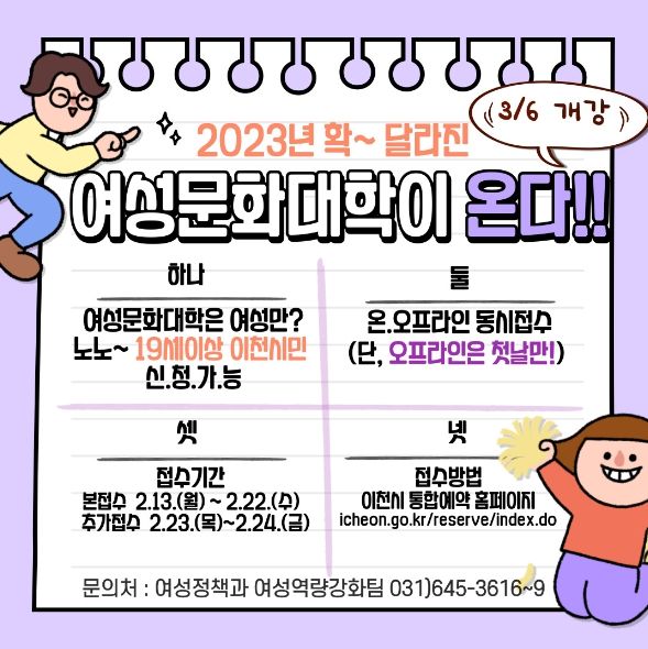특히 올해는 여성 위주로 신청 가능했던 기존의 제도를 바꾸어 만19세 이상 이천시에 거주하고 있는 사람이라면 누구나 수강 신청이 가능하며, 이천시 통합예약 홈페이지를 통한 온라인 선착순 접수와 더불어 접수 첫 날인 2월 13일 월요일에는 컴퓨터 사용에 취약한 시민도 접수가 가능하도록 여성회관 2층 정보화실을 개방하는 등 오프라인 접수를 병행한다.
