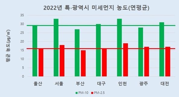 또한 2022년 울산의 미세먼지 연평균 농도는 △미세먼지(PM10) 29㎍/㎥ (7대 특․광역시 평균 30㎍/㎥) △초미세먼지(PM2.5) 16㎍/㎥(7대 특․광역시 평균 17㎍/㎥)로 7대 특․광역시 평균보다 낮았다.