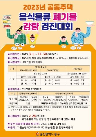 [제주교통복지신문 김강석 기자] 울산시 동구청은 주민들의 음식물류 폐기물 감량에 대한 적극적 관심과 자발적 참여를 유도하기 위해 관내 100세대 이상 공동주택을 대상으로 ‘공동주택 음식물류 폐기물 감량 경진대회’를 실시한다.