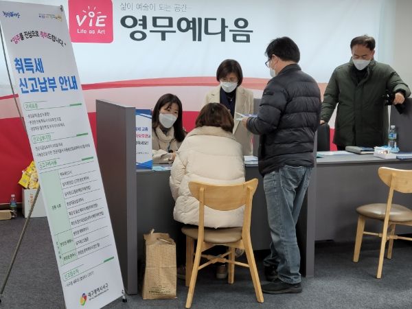이번 ‘이동 세무 사무소’는 서대구KTX영무예다음 사전점검일인 2월 3일부터 5일까지 사흘 동안 아파트 내 상담부스를 설치하여 운영했으며 취득세 업무 담당자 및 납세자보호관 등으로 편성된 상담반이 130여명의 입주 예정자에게 다주택자 취득세 중과, 생애최초 감면 등 입주 시 필요한 취득세 등에 대하여 세무 상담 서비스를 제공했다.