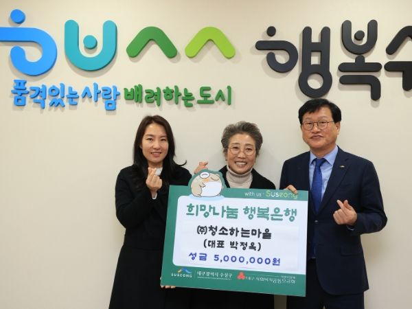 [제주교통복지신문 김강석 기자] 자활기업인 ㈜청소하는마을은 지난 6일 어려운 이웃들을 위해 써달라며 이웃돕기 성금 500만 원을 수성구청에 전달했다.