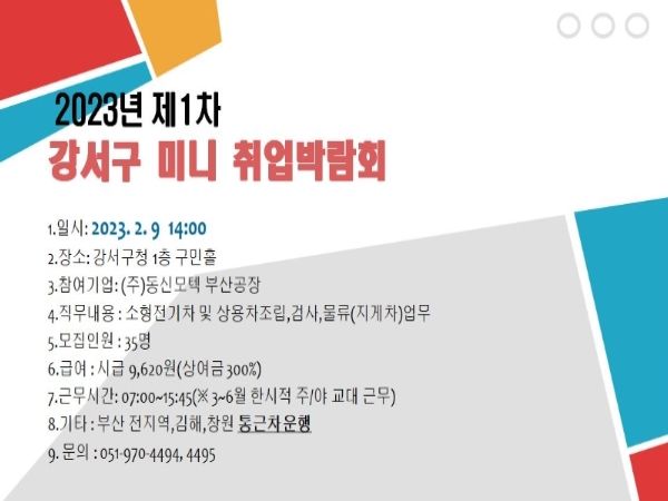 [제주교통복지신문 김강석 기자] ‘2023년 제1차 강서구 미니 취업박람회’가 2월 9일(목) 오후 2시 강서구청 구민홀(1층)에서 개최된다.
