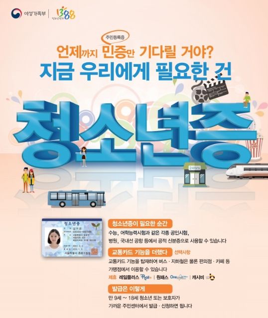 청소년증은 만 9~18세 청소년이 공적 용도로 사용할 수 있는 신분증이다. 학교에 다니지 않아도 발급받을 수 있고, 대학수학능력시험, 검정고시, 어학능력시험 등에서 공인 신분증으로 쓸 수 있다.
