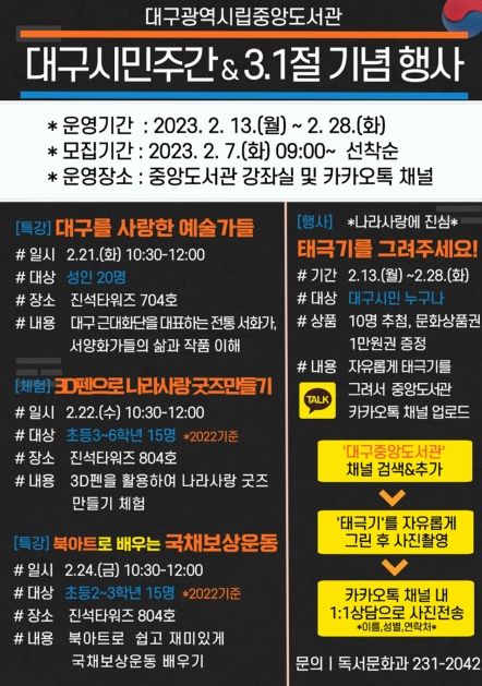 주요 행사로는 대구시민이라면 누구나 자유롭게 태극기를 그려서 대구중앙도서관 카카오톡 채널에 업로드하면 10명을 추첨해 문화상품권을 증정하는 ▲(나라사랑에 진심) 태극기를 그려주세요!(2.13.~2.28.)를, 성인 20명을 대상으로 대구에서 활동한 전통 서화가 및 서양화가의 삶과 작품에 대해 알아보는 ▲대구를 사랑한 예술가들(2.21.) 특강을 운영한다.