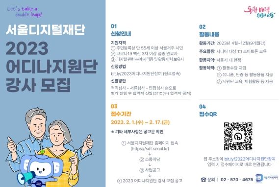 서울디지털재단은 지난 4년간 '어디나지원단' 강사 500명을 양성해서울시어르신 2만 7천명을 교육했다. 올해는 2만명 이상 고령층(전년대비30% 증가)에게 교육을 제공하는 것으로 확대·운영한다.