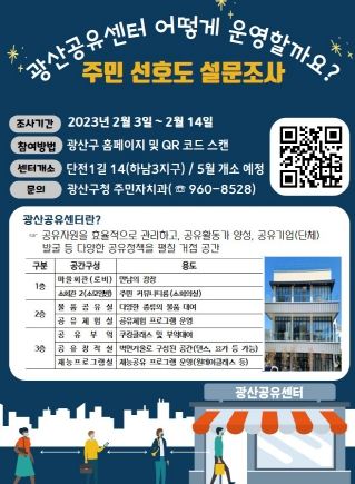 [제주교통복지신문 김강석 기자] 광주 광산구는 5월 개소 예정인 광산공유센터 운영에 주민 의견을 반영하기 위한 선호도 설문조사를 진행한다고 밝혔다.