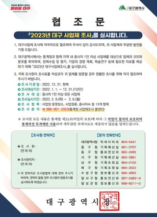 [제주교통복지신문 김강석 기자] 대구시는 2월 9일부터 3월 6일까지 2022년 12월 31일 기준 지역 내에서 산업 활동을 하고 있는 종사자 1인 이상의 모든 사업체를 대상으로 사업체 조사를 실시한다.
