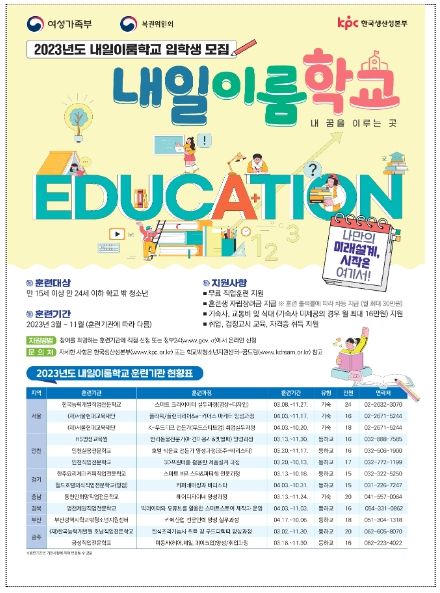 참여를 희망하는 청소년은 ‘정부 24(www.gov.kr)’에서 온라인으로 신청하거나 학교밖청소년지원센터 ‘꿈드림’, 또는 중앙운영기관인 ‘한국생산성본부’ 누리집을 참고해 ‘2023년 내일이룸학교 훈련기관’에 유선으로 신청하면 된다.
