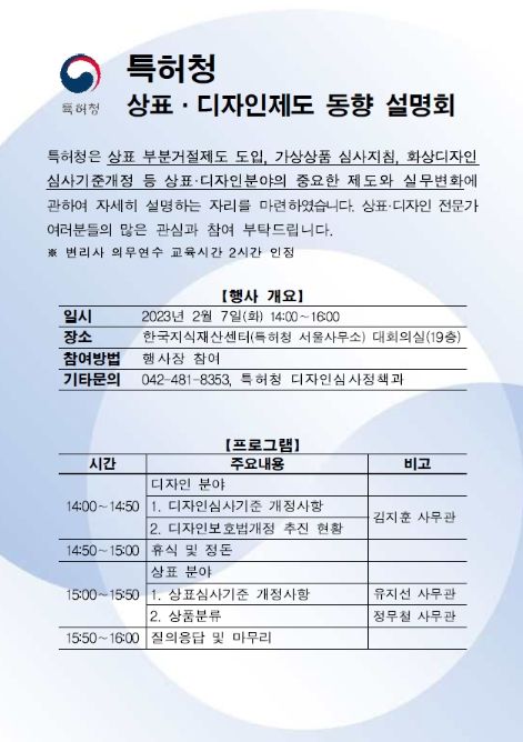 지난 ‘20년 이후 3년 만에 대면행사로 개최되는 이번 설명회는 지난해 상표법 개정에 따라 올해 2월 4일부터 시행하고 있는 “상표 부분거절제도”와,디지털 환경에서의 상표권·디자인권 보호 강화를 위해 작년 7월부터 시행 중인 “가상상품 심사지침”, 올해 1월부터 적용 중인 “개정 화상디자인 심사기준”을 중심으로 진행된다.