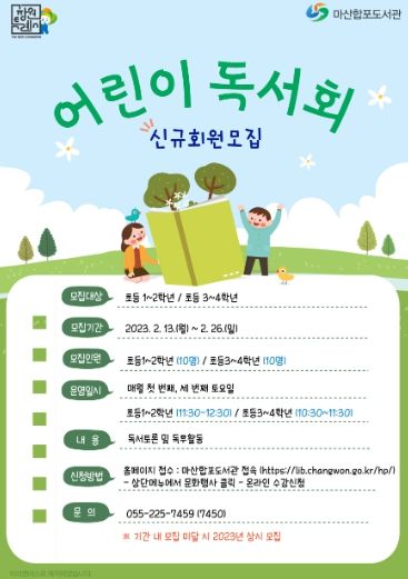 어린이 독서회는 초등1~2학년, 초등3~4학년 2개 반으로 나누어 매월 첫 번째, 세 번째 토요일 오전에 운영하며, 신규회원 모집은 2월 13일부터 26일까지 도서관 누리집에서 온라인으로 접수받는다.