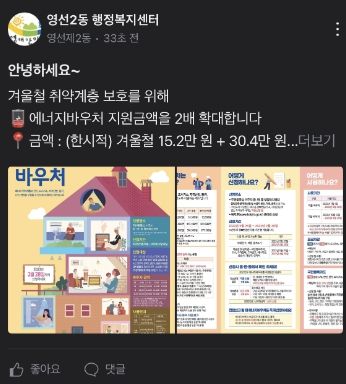 영선2동은 당근마켓을 통해 최근 에너지 요금 급등으로 인해 문의가 많은 에너지바우처 미신청자에 대한 홍보를 진행했으며, 앞으로 복지정보, 구정소식 등 주민에게 도움이 되는 생활정보를 월 1~2회 제공할 계획이다.