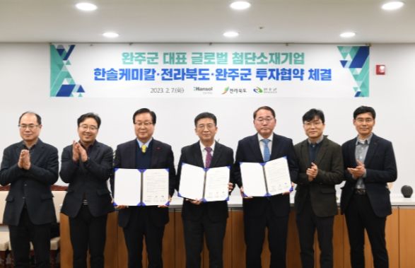 완주군은 7일 오후 군청 4층 전략회의실에서 김종훈 전북도 경제부지사와 유희태 군수, 박준규 ㈜한솔케미칼 완주공장장 등이 참석한 가운데 ‘한솔케미칼 완주공장 증설투자 MOU 체결식’을 갖고 완주일반산단 내 제1공장 부지에 올해부터 내년까지 총 400억 원을 증설 투자하는 협약에 서명했다.