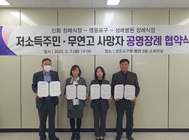 [제주교통복지신문 김강석 기자] 영등포구가 무연고 및 저소득 주민 사망자의 공영 장례를 위해 지난 7일 관내 신화장례식장 및 성애병원장례식장과 업무협약(MOU)를 체결했다고 밝혔다.